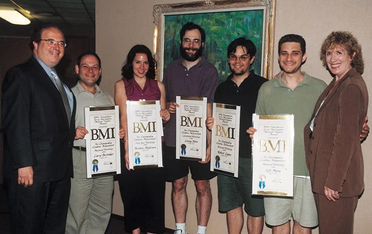 Recipients of the First Annual BMI Foundation/Jerry Harrington Musical Theatre Award for Outstanding Creative Achievement are pictured here after receiving their certificates in July of 2000. (L-R): BMI’s Gary Roth; Larry Bortniker, Advanced Workshop Award; Kristen Anderson, First Year Workshop Award; Lenny Hort, Librettists Workshop Award; Robert Lopez, Advanced Workshop Award; Jeff Marx, Advanced Workshop Award; and BMI’s Jean Banks.