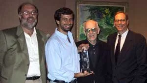 Charlie Parker Jazz Composition Prize winner Jamie Begian (center) shows off his BMI Crystal after the presentation to workshop members Scott Reeves, Anita Brown and Rufus Reid, winner of last year’s first Charlie Parker Composition Prize; judges Dan Morgenstern and Phil Schaap; workshop member Rob Middleton, winner of the 1999 Jerry Harrington Composition Award; workshop members J.C. Sanford, Rex Cadwallader, Laura Andel, winner of the 1997 Jerry Harrington Composition Award, and Joe Phillips; workshop director Burt Korall; workshop members Ed Xiques and Debra Weisz; workshop co-musical director Jim McNeely; judge Bill Kirchner; and (kneeling) BMI’s Charlie Feldman. photo: Gary Gershoff